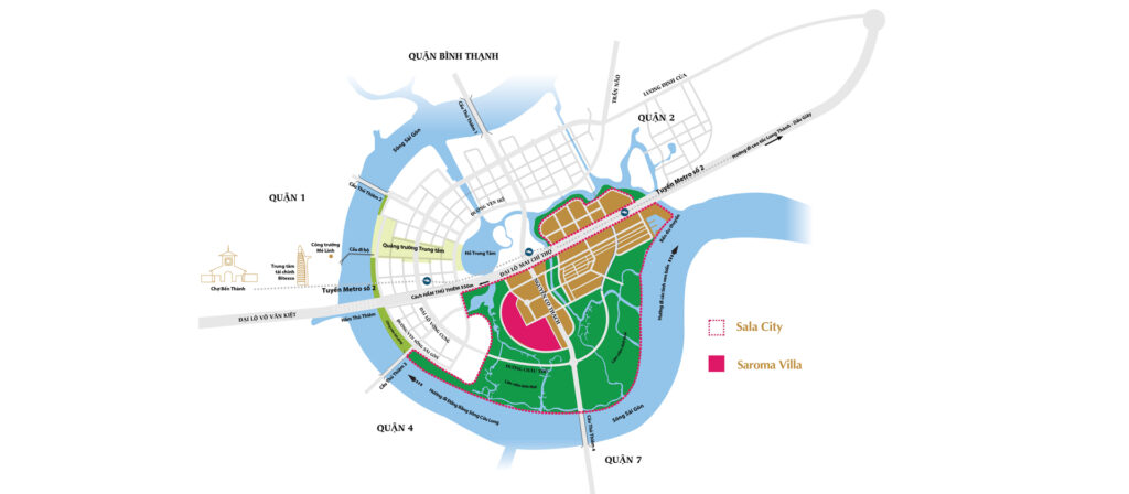 VỊ TRÍ DỰ ÁN KHU ĐÔ THỊ SALATọa lạc trên đại lộ Mai Chí Thọ, cách Hầm Thủ Thiêm khoảng 550m, Khu đô thị Sala sở hữu vị trí thuận tiện nhất để kết nối với các quận, huyện khác của thành phố và các tỉnh miền Đông và miền Tây Nam Bộ. Thuận tiện kết nối với quận 1 bằng đường Hầm Thủ Thiêm, cầu Thủ Thiêm 2.