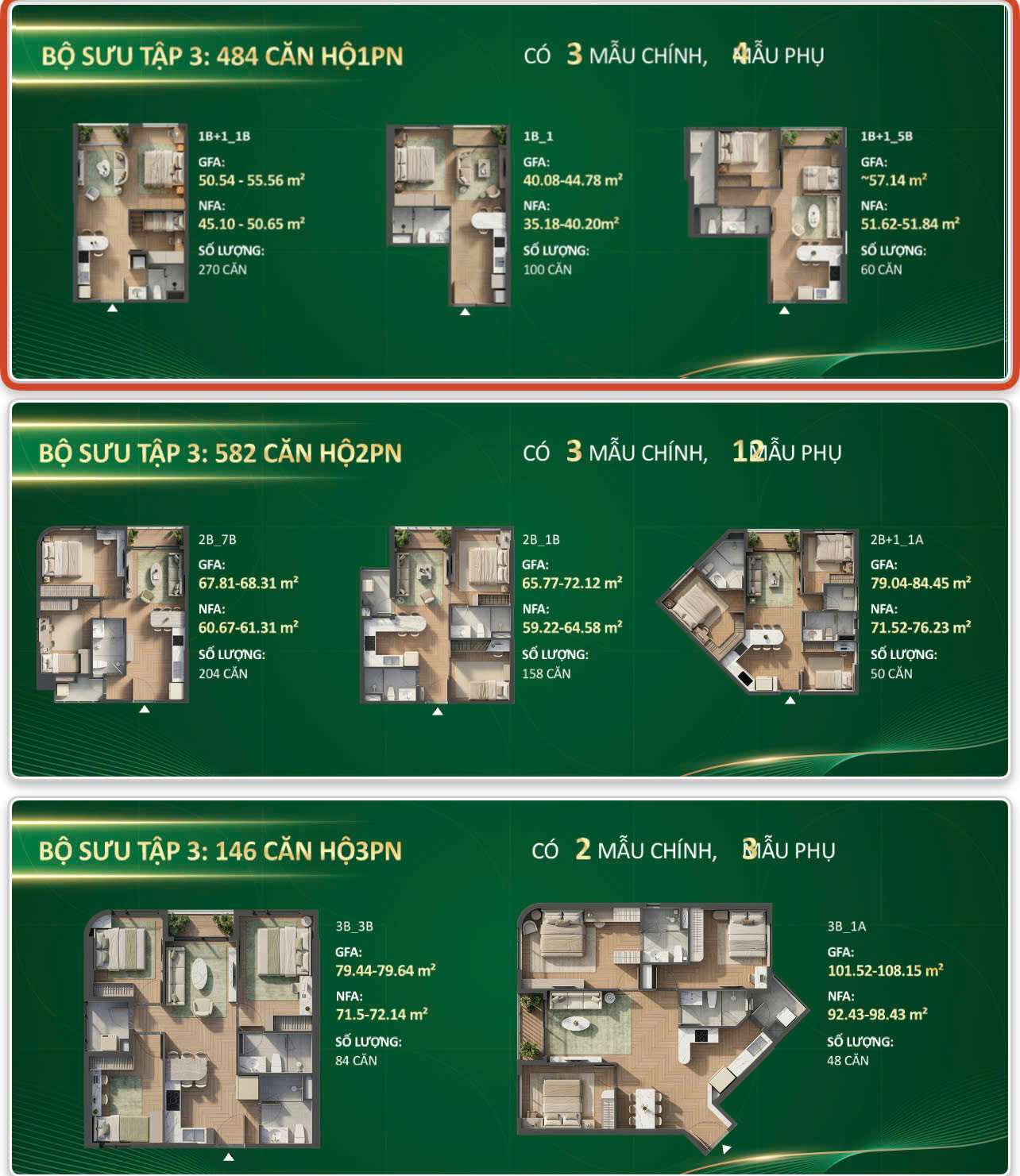 - Căn 3PN: 77 m² – 105 m²