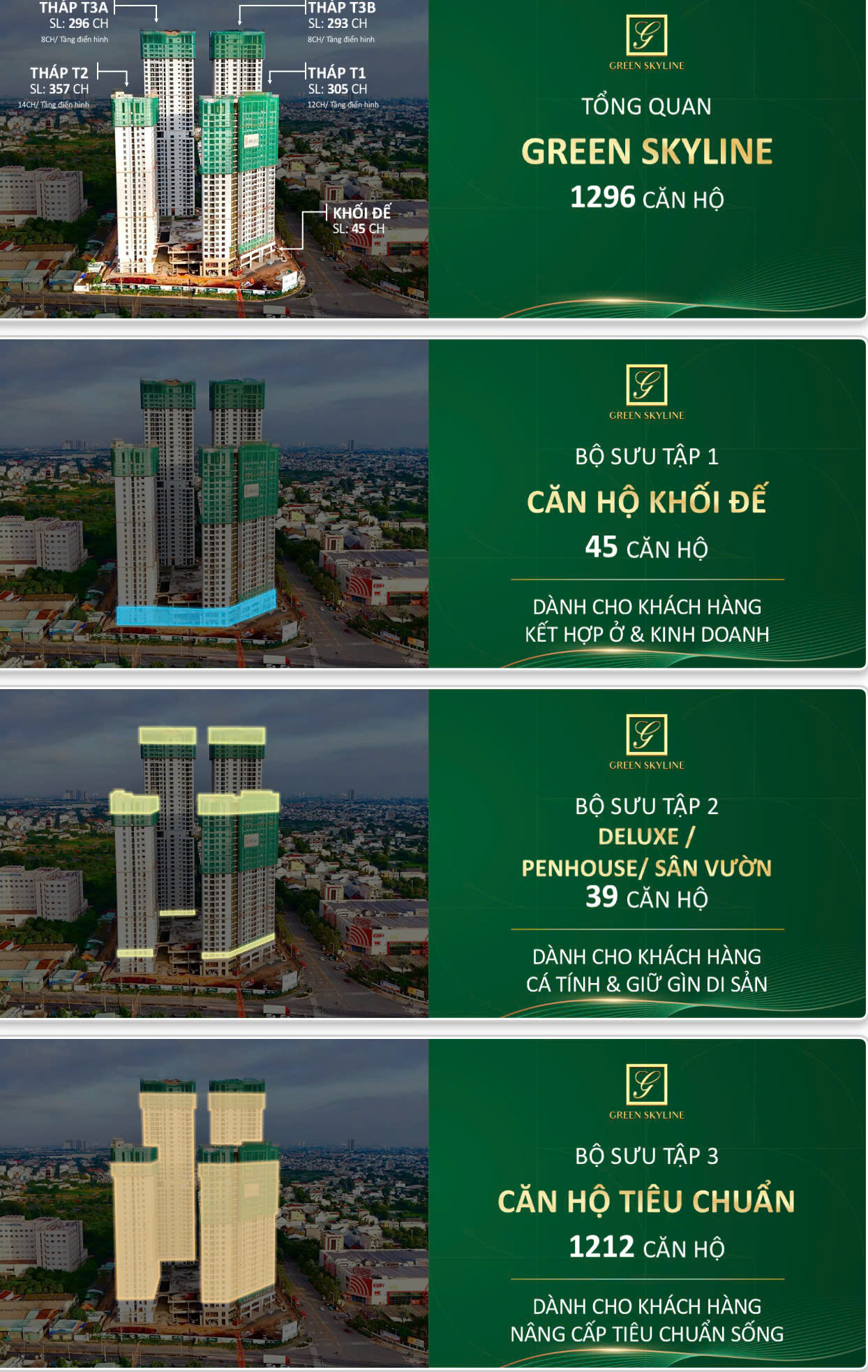 “Được quy hoạch bài bản trên quỹ đất 1,32 ha, Green Skyline là tổ hợp đô thị tích hợp đa chức năng gồm 4 tòa tháp cao từ 28 đến 40 tầng. Dự án cung cấp ra thị trường 1.296 sản phẩm với cơ cấu đa dạng, bao gồm: căn hộ tiêu chuẩn 1–3 phòng ngủ (45–109 m²) thiết kế linh hoạt, hệ thống Shophouse khối đế phục vụ kinh doanh sầm uất, cùng các phiên bản giới hạn Duplex & Penthouse sang trọng sở hữu tầm nhìn panorama đắt giá. Tất cả kiến tạo nên một chuẩn sống tiện nghi, đáp ứng trọn vẹn nhu cầu an cư kết hợp đầu tư kinh doanh bền vững.”